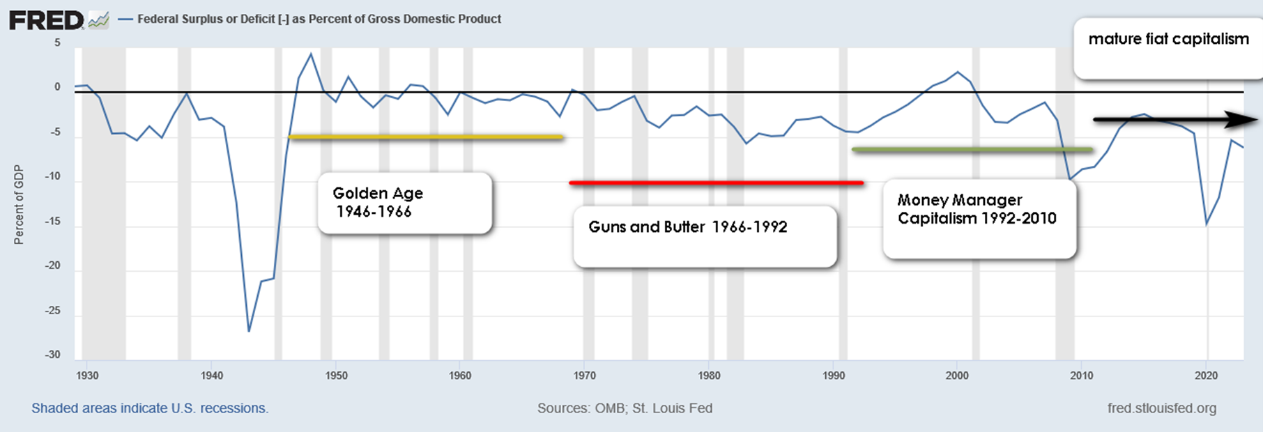 Paternalistic managerial welfare state capitalism from the establishment the New Deal, extending through the Second World War includes the post-war “Golden Age”. According to Minsky, a “much larger government and an economically activist state which, in the realm of research, infrastructure development, expansion of secondary education, and military production, played a major role in determining the direction and volume of investment. The weight of the “Big Government” stabilized the economy, mediating risk and sustaining entrepreneurial profit. Government effectively guaranteed profit flows to large corporate interests. Financial speculation was significantly restricted. (Minsky 1992 p 110-11) “The government securities market was the primary position making market” (Minsky 1986 p81) It was at the beginning of this period that the “failed” capitalism of the early 20th century transformed, in Minsky’s view, into a relatively successful and apparently sustainable capitalism. In the 1970s this system began a rapid crisis-born evolution toward a different form.