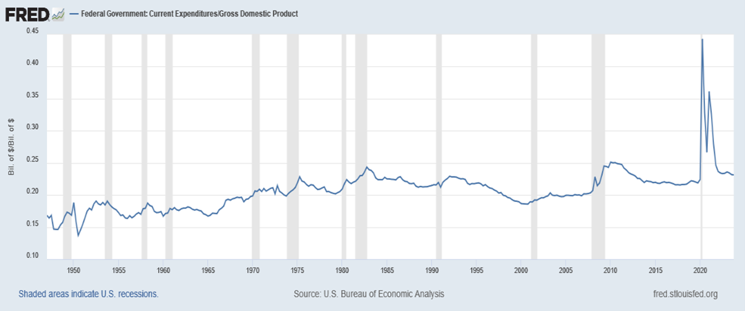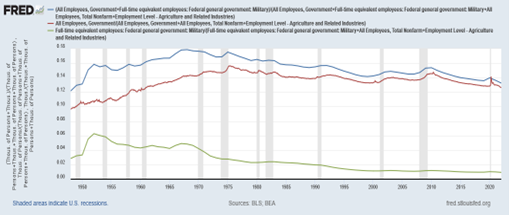 Contrary to many writers’ representations of the Golden Age and expressed nostalgia for the New Deal, government was smaller relative to population or output when compared to the later periods. The government sector grew necessarily during the GBE in both absolute terms and relative to the US population and economy. Significant growth in the size and role of government had taken place during the Great Depression and World War II years, but growth continued in the period after the 1966 crunch.